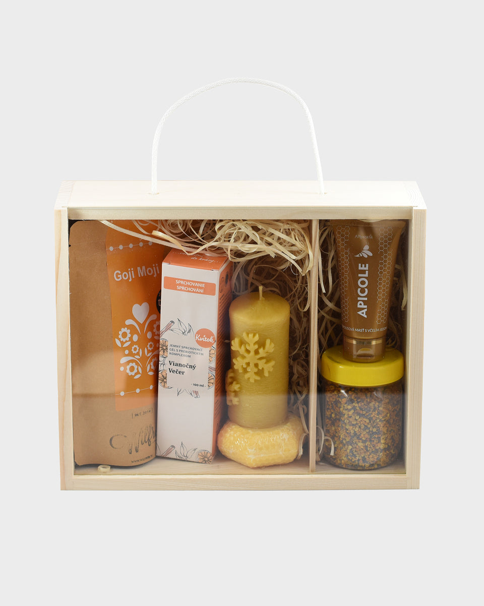 Darujte chvíle pohody, tepla a radosti s týmto exkluzívnym darčekovým balíčkom. Starostlivo zostavená kombinácia poteší všetky zmysly, vytvára harmonický zážitok pre telo aj dušu a elegantné balenie v drevenej krabičke so sklom podčiarkuje jeho výnimočnosť.